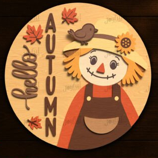 “Hello Autumn” Round Sign Project with a Scarecrow. This product is unfinished and arrives as unpainted MDF for you to finish any way you want!