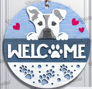 “Welcome” Round Sign with a Dog peeking over.  This product is unfinished and arrives as unpainted MDF for you to finish any way you want!