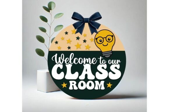 “Welcome to our Classroom” with lightbulb round sign. Â This product is unfinished and arrives as unpainted MDF for you to finish any way you want!