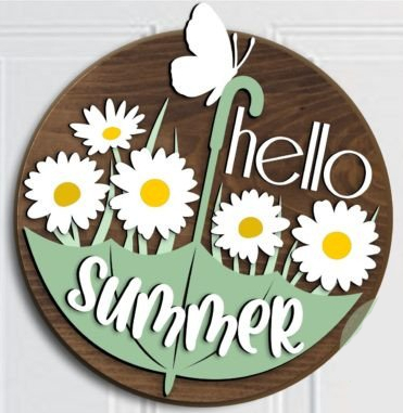 “Hello Summer” Round Sign Project with Daisies, Umbrella and Butterfly. This product is unfinished and arrives as unpainted MDF for you to paint and assemble it yourself.